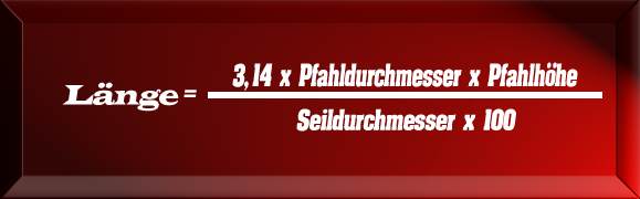 Meist sind die Kletterbäume eine mit Sisal umwickelte stabile Röhre oder Pfahl. Zur Berechnung der Sisal-Seillänge benötigt man den Durchmesser und die Höhe des Pfahls sowie den Durchmesser des Seils (alle Werte in Zentimetern). Das kann man dann einfach in diese Formel einsetzen und bekommt die Seillänge in Metern heraus:
